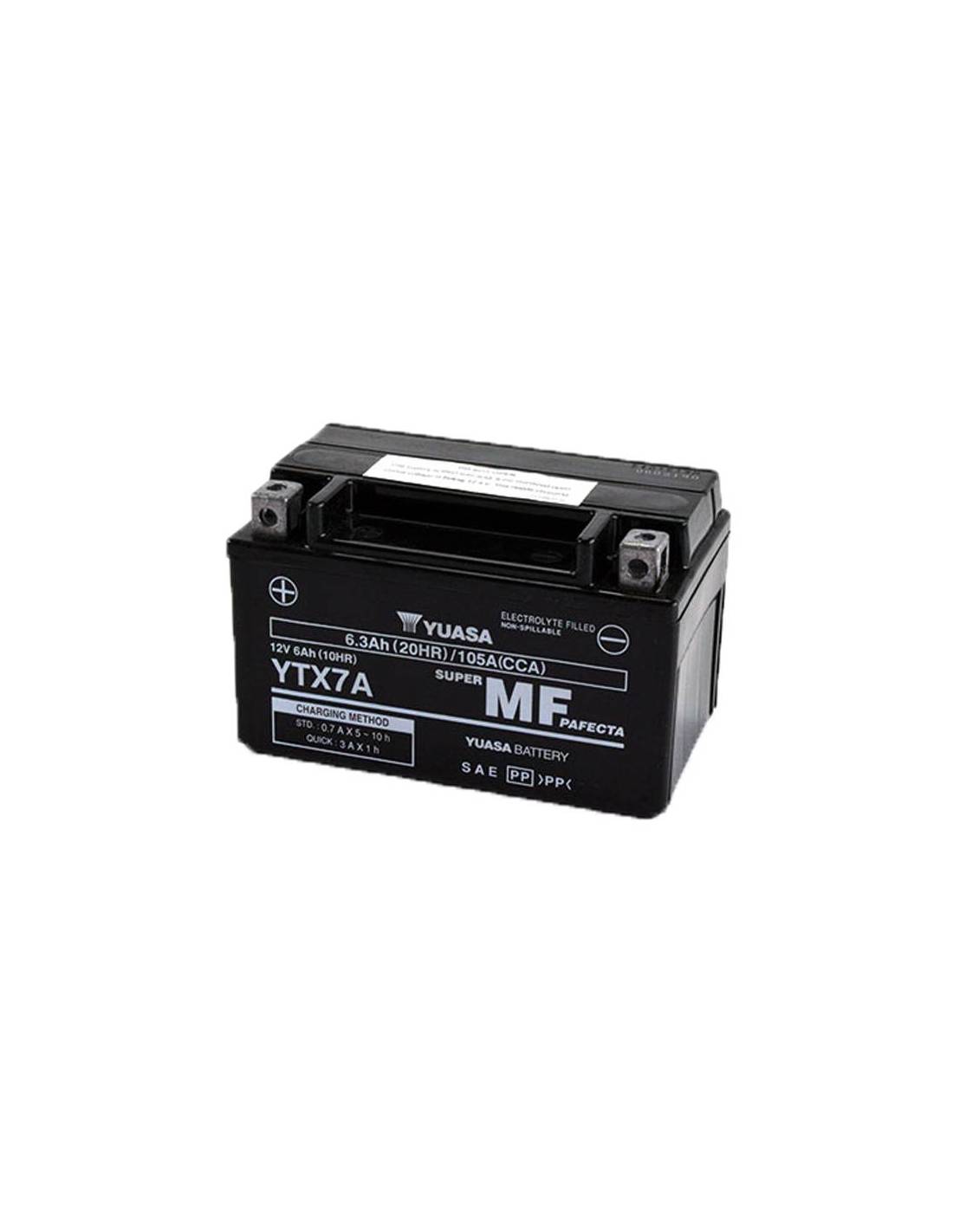 La batería Yuasa YTX7A-BS de 12V y 6Ah se envían en seco, junto con las botellas de ácido que se agregará en el momento de la instalación. Una vez llenas de ácido, las baterías AGM son prácticamente libres de mantenimiento, se queda totalmente sellada y todo el ácido es absorbido por las placas especiales y separadores, así que no hay necesidad de preocuparse por fugas de ácido con la consecuente corrosión en partes del vehículo y sus accesorios.