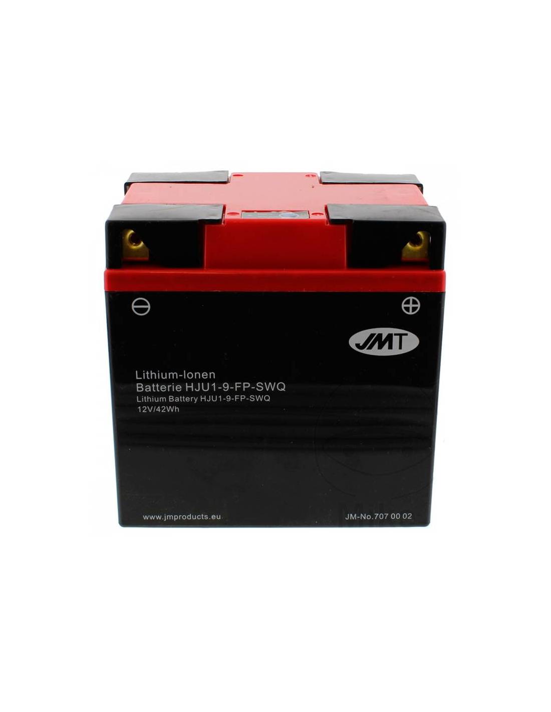 Batería de moto Litio JMT HJU1-9-FP-SWQ 12V 24Ah, especial para motocicletas, ciclomotores o scooter. Reduce peso, aumenta potencia, y evita derrames.
