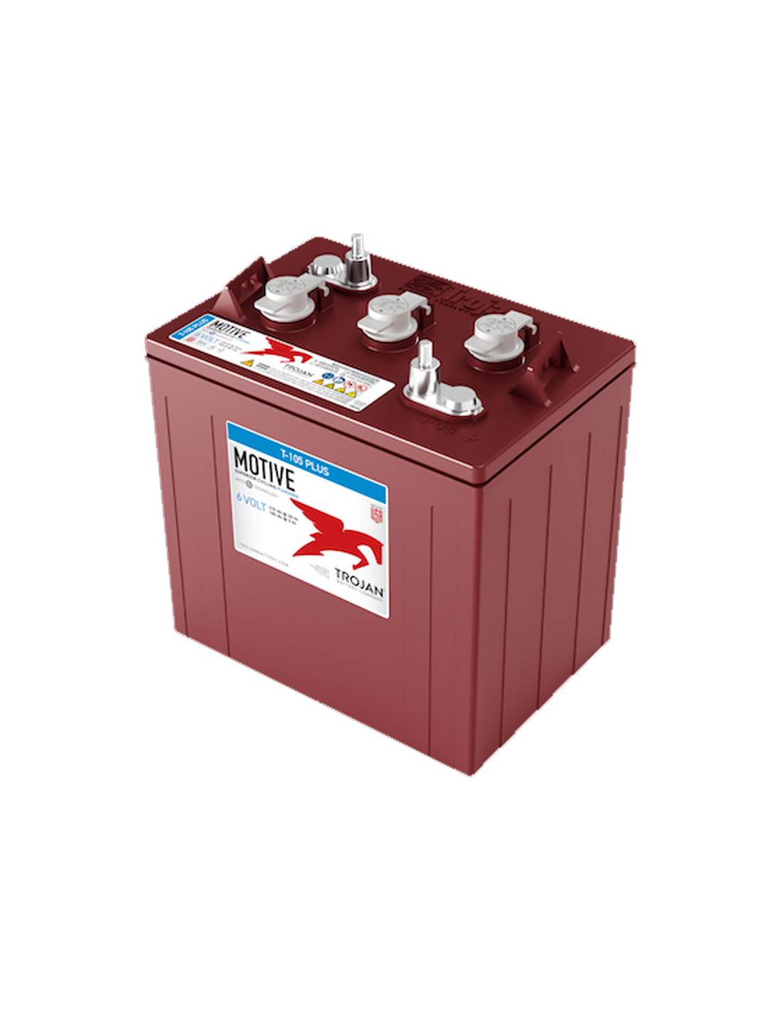 Batería trojan t105 Plus 6V 225Ah en C20, utiliza la tecnología de pasta Alpha Plus con separador Maxguard T2, es la mejor opción para aplicaciones de tracción y semi-tracción eléctrica de maquinaria industrial, como coches de golf eléctricos, barredoras, fregadoras industriales, plataformas elevadoras, etc..
