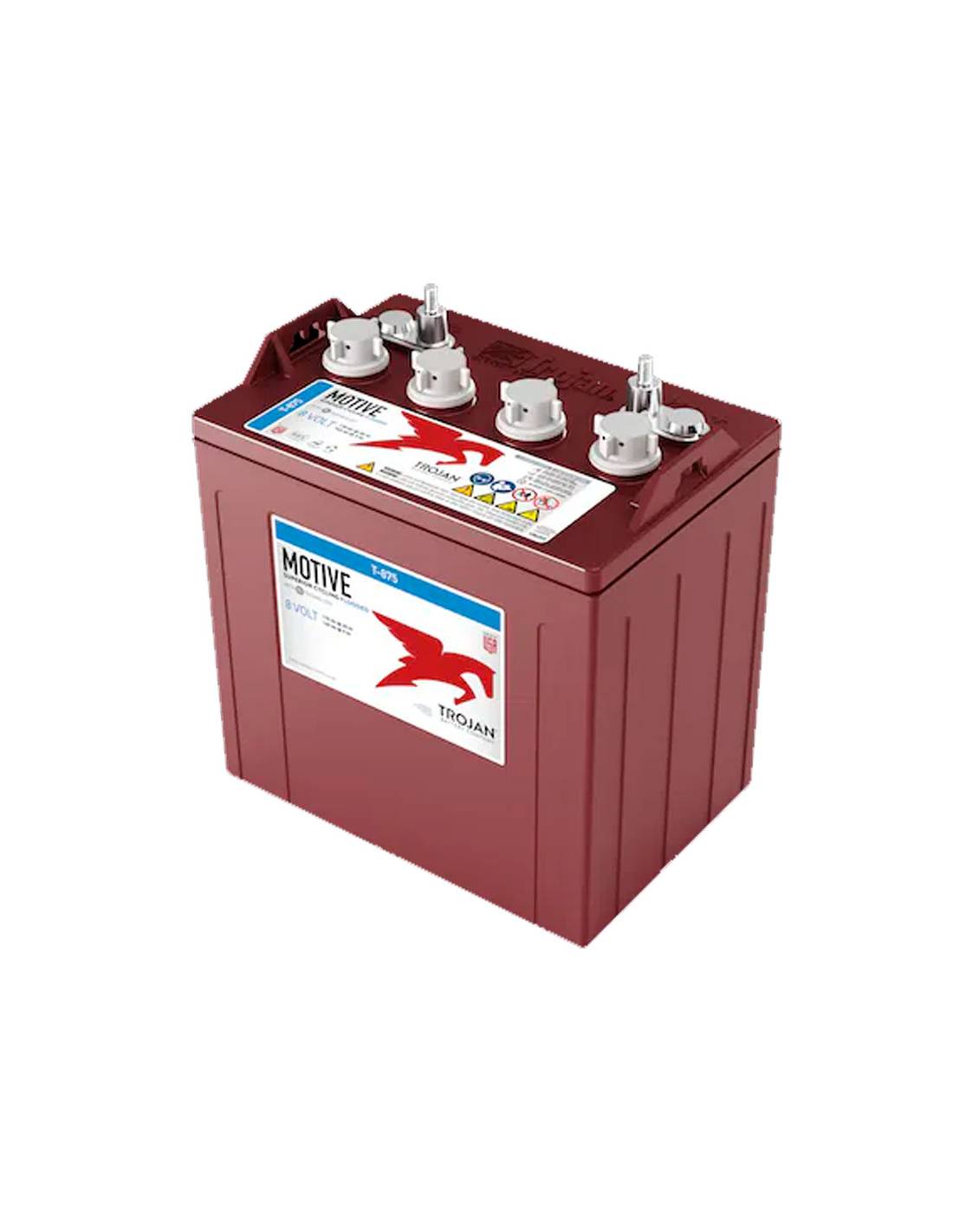 Batería Trojan T-875 de 8 Voltios y 170 Amperios, con tecnología de pasta Alpha Plus, separador Maxguard T2, es la mejor opción para aplicaciones en semi-tracción como coches de golf eléctricos, barredoras y fregadoras industriales, plataformas elevadoras.