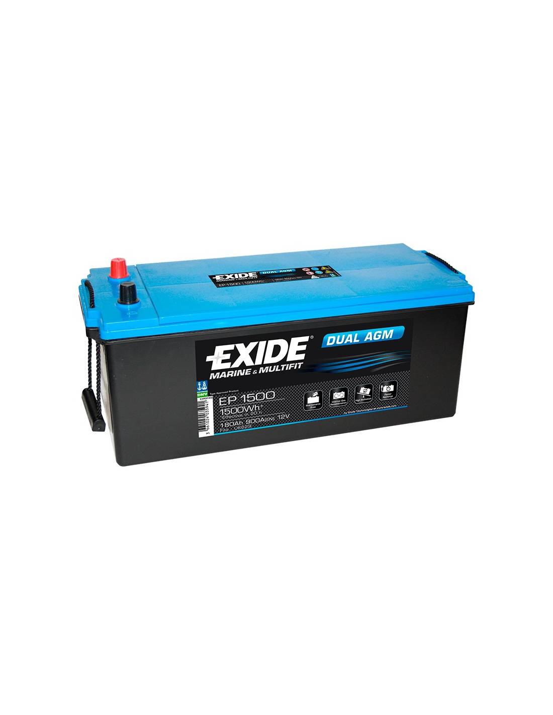 Batería EXIDE Dual AGM EP1500 de 12 voltios y 180 amperios hora en tecnología Dual AGM Sin mantenimiento.