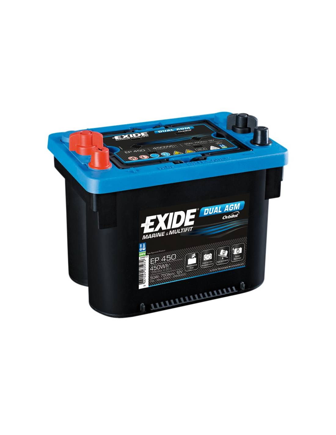 Batería de EXIDE Dual AGM EP450 de 12 voltios y 50 amperios hora en tecnología Dual AGM Sin mantenimiento.