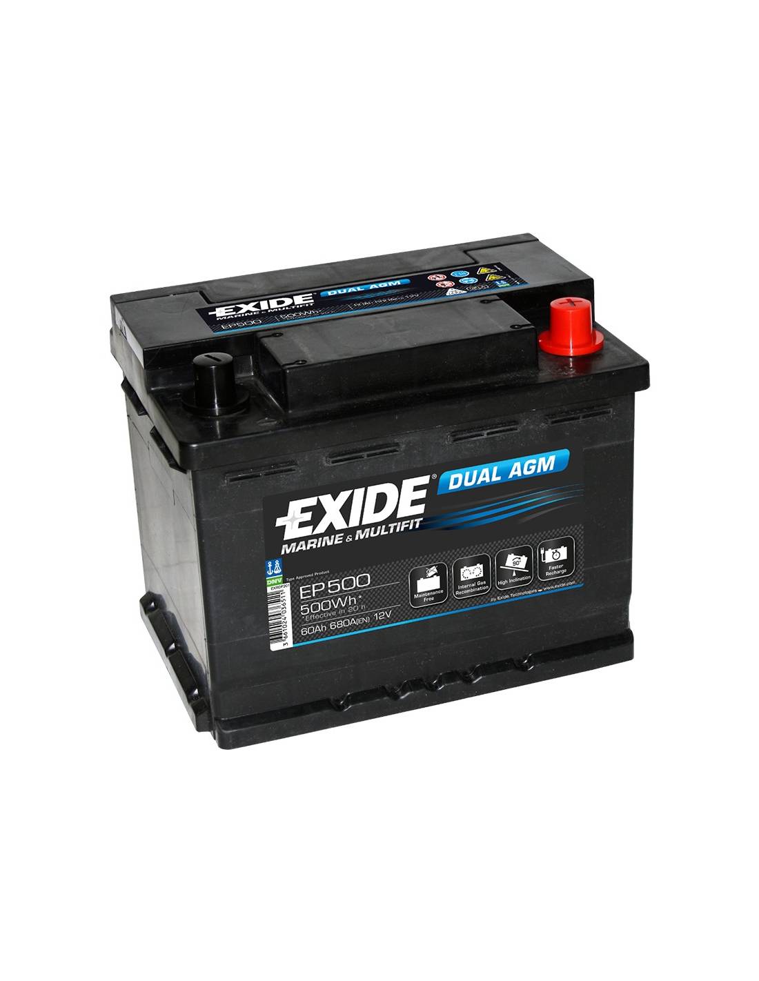 Batería EXIDE Dual AGM EP500 de 12 voltios y 60 amperios hora en tecnología Dual AGM Sin mantenimiento.